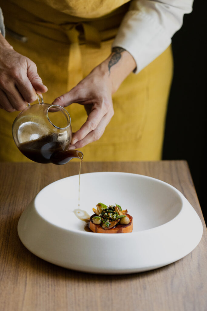 Très engagée dans une démarche locavore et zéro-déchet avec des assiettes valorisant le végétal, elle souhaite aller plus loin dans cette démarche et décide de trouver un terrain proche de Paris pour y cultiver ses propres légumes et fruits. La visite du Domaine les Bruyères a été un coup de cœur et le projet a pris une autre envergure : un parc de 1,5 hectares sur lequel ils ont créé leur potager en permaculture de 2000 m2 et une forêt fruitière. Ils ont également rénové la bâtisse qui date de 1850 pour ouvrir 5 chambres d’hôtes et RUCHE, le restaurant à l’automne 2019. Travaillant son propre écosystème, elle propose une cuisine de l’instant en appliquant les techniques ancestrales pour sublimer les produits provenant du potager et d’artisans/éleveurs situés à quelques kilomètres du Domaine.